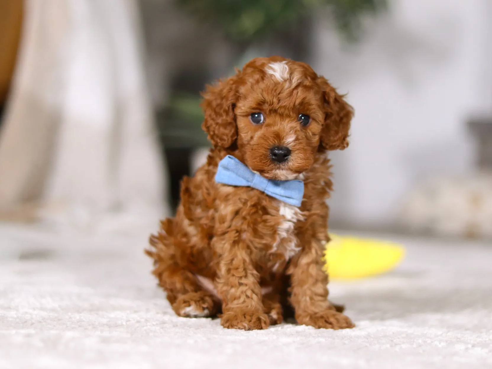 Reese is a bright red first generation backcross Cavapoo (75% poodle) with a striking white chest and sweet white toes. He has dark, expressive eyes and a dark nose that beautifully contrast his rich coloring. Reese sports a very curly, fluffy coat that gives him an extra cuddly look. He comes from genetically tested and cleared parents and has been raised with early neurological stimulation (ENS). He’s already started early training, including crate routines and learning to potty in a designated area.